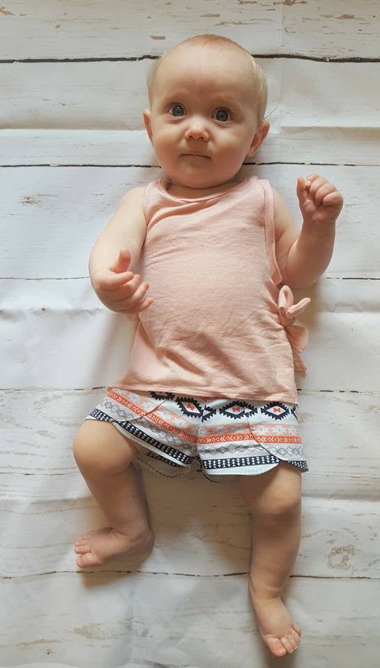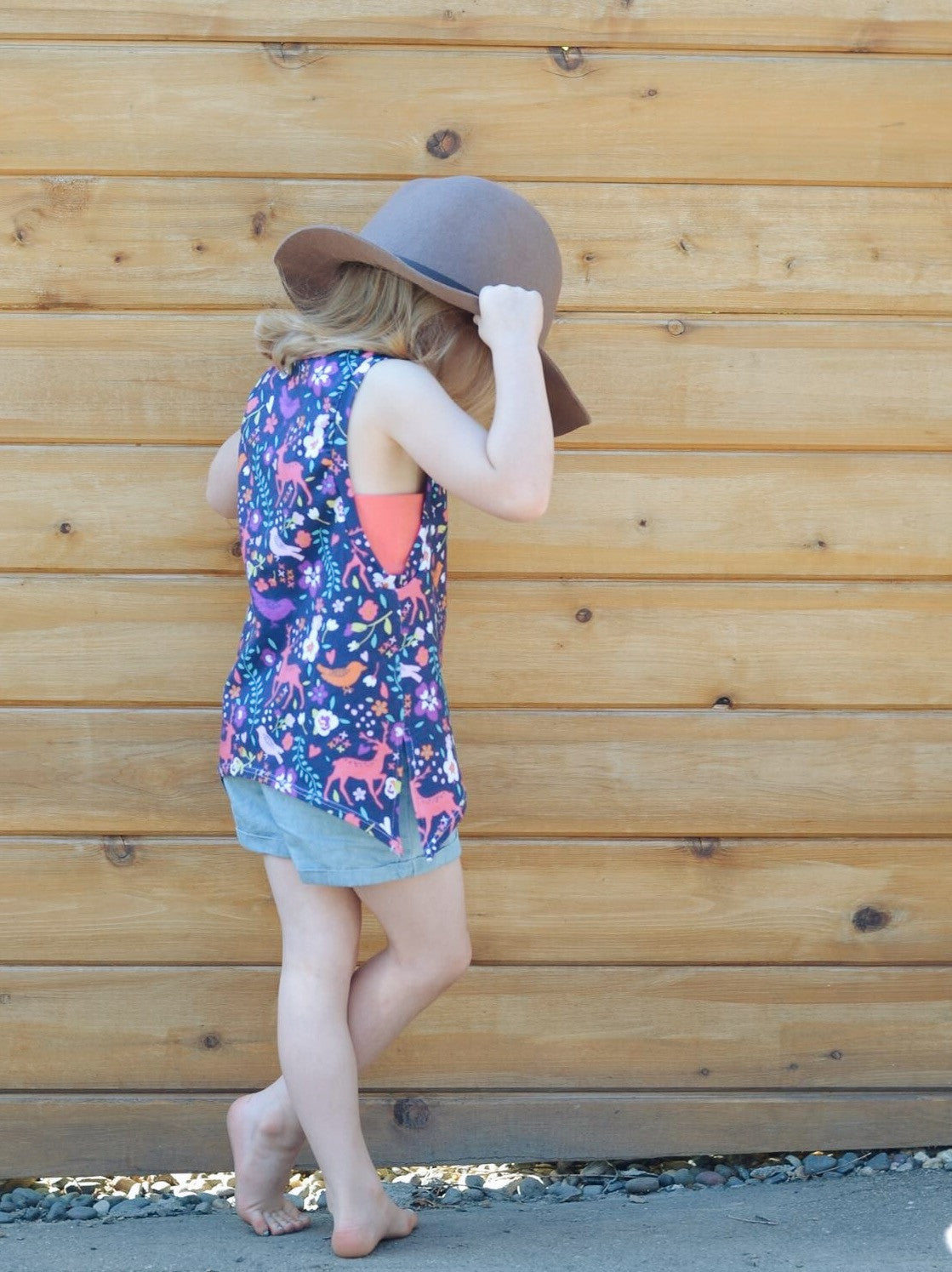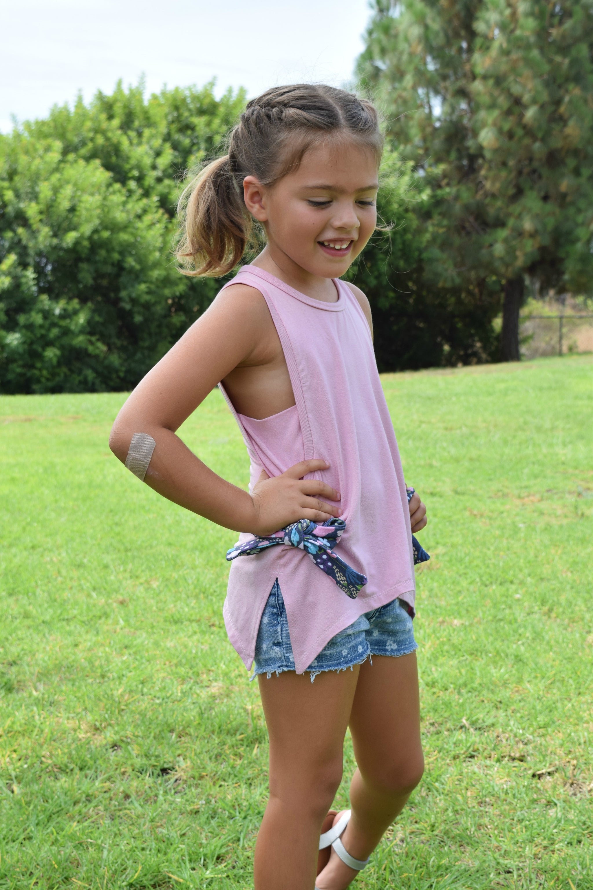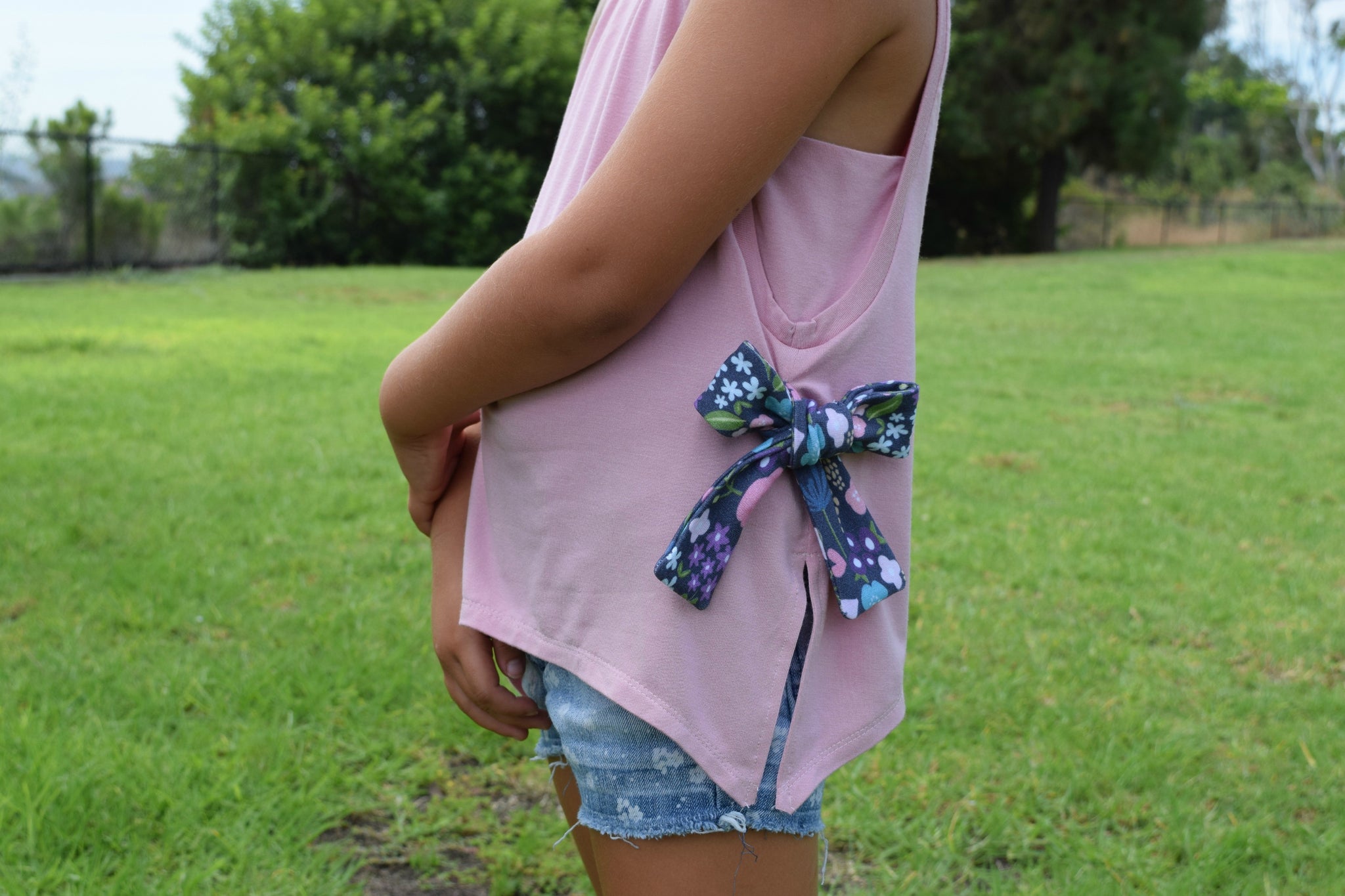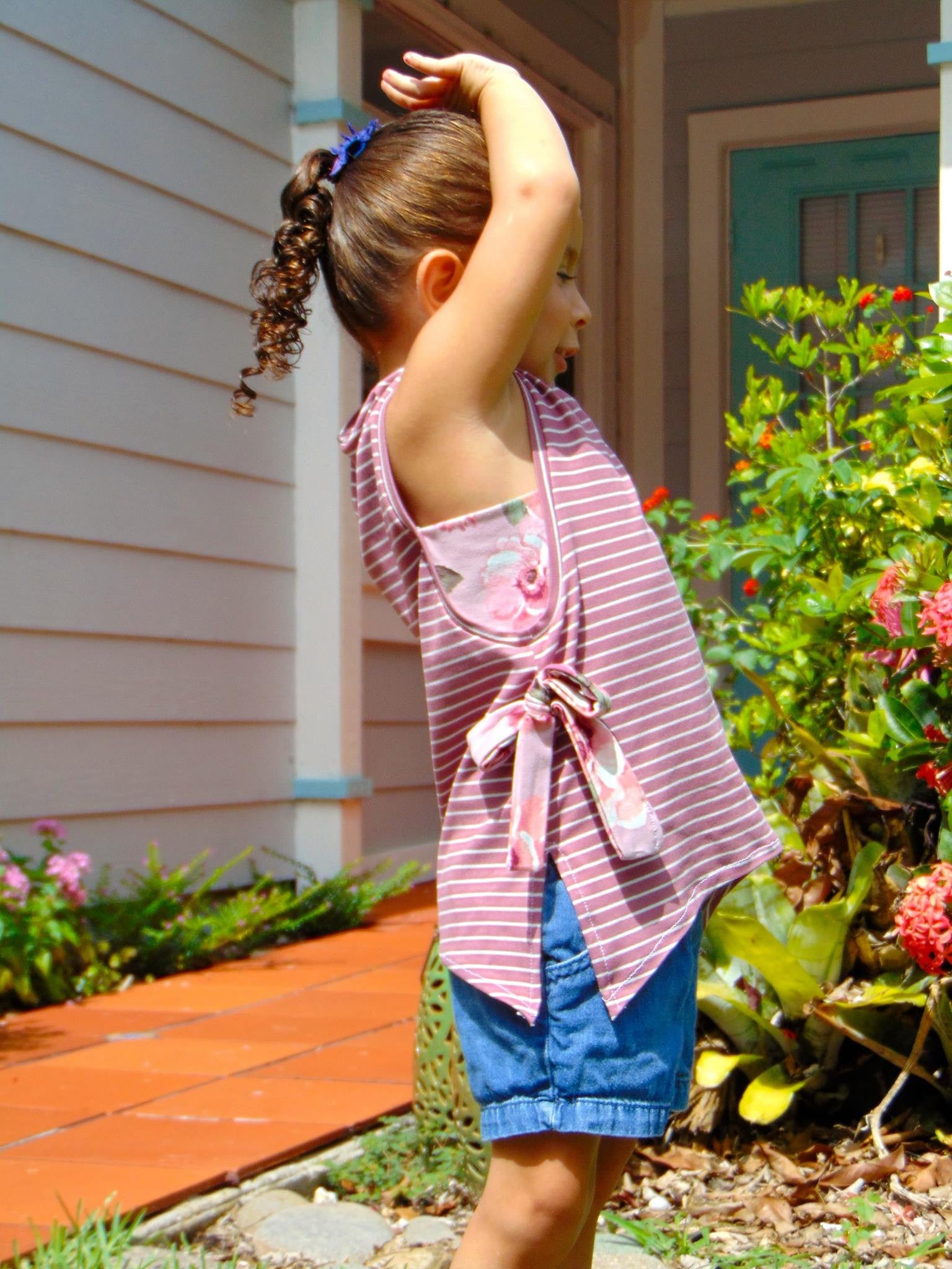 This easy fitting tank featuring vented sides and the option for decorative bow-ties at each side is the perfect staple for summer. The Moon Dance Tank can be made with a lace side piece for a hint of fun.The sidepiece can also be made with a printed or solid panel for a layered look and is a great use of scraps.