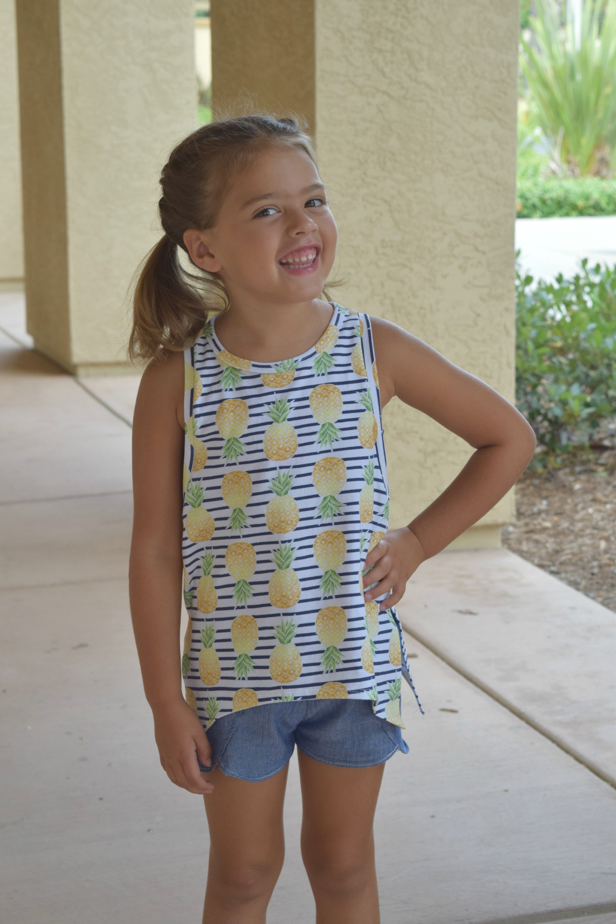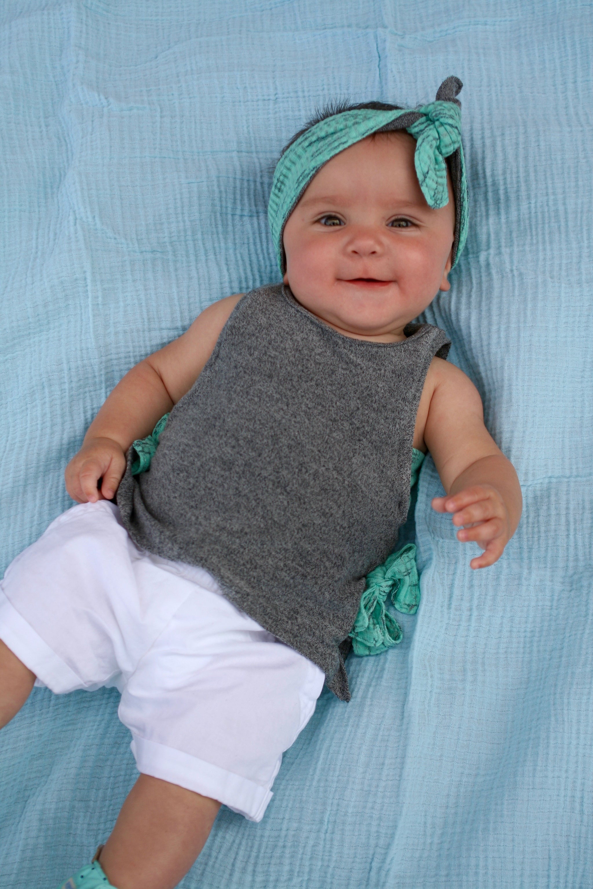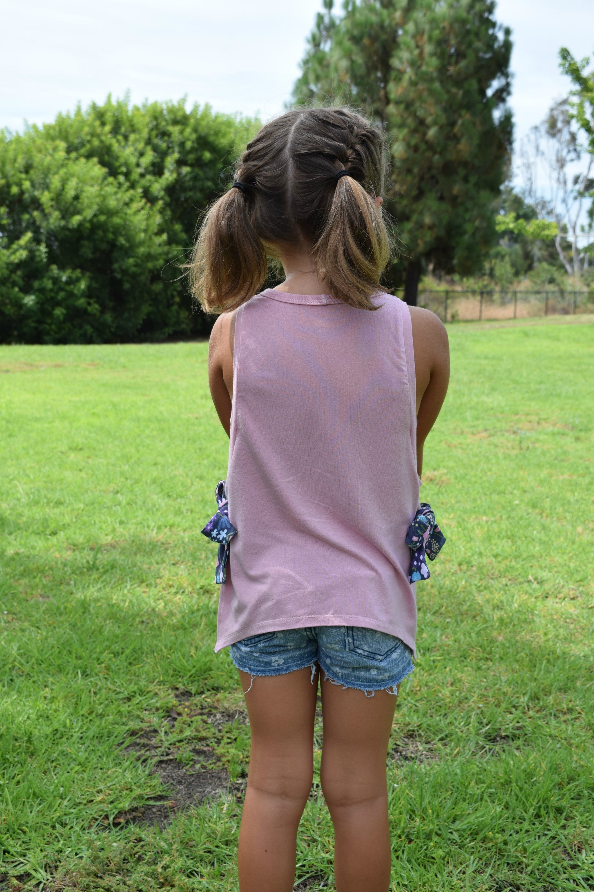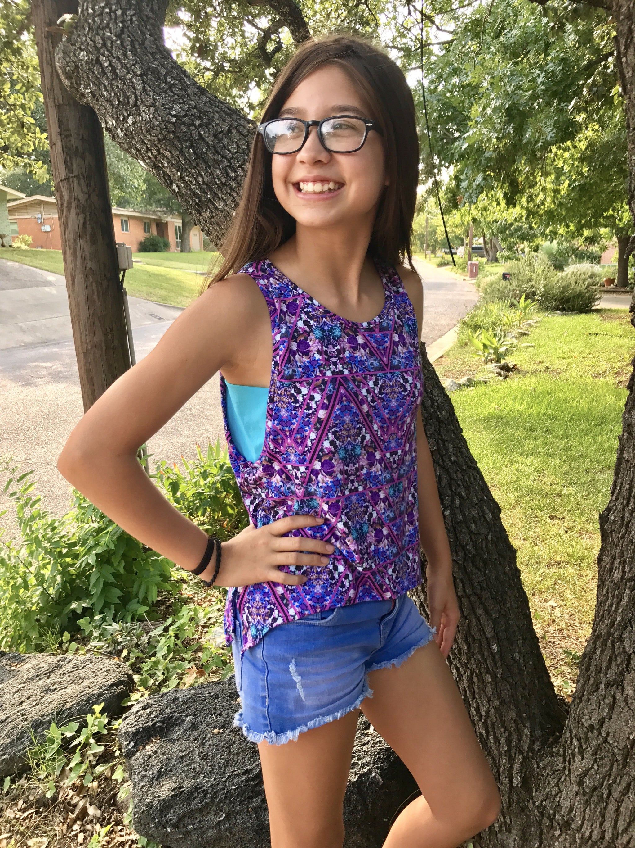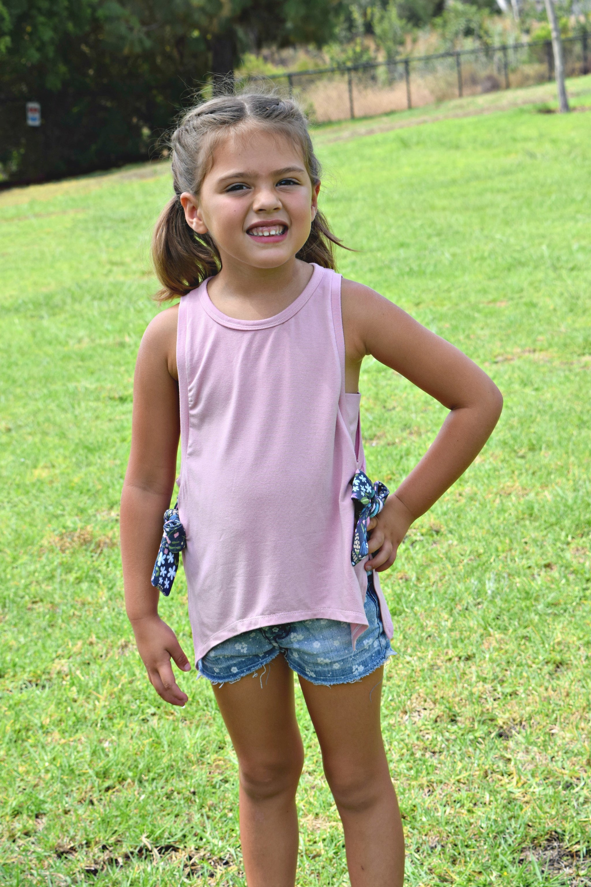 This easy fitting tank featuring vented sides and the option for decorative bow-ties at each side is the perfect staple for summer. The Moon Dance Tank can be made with a lace side piece for a hint of fun.The sidepiece can also be made with a printed or solid panel for a layered look and is a great use of scraps.