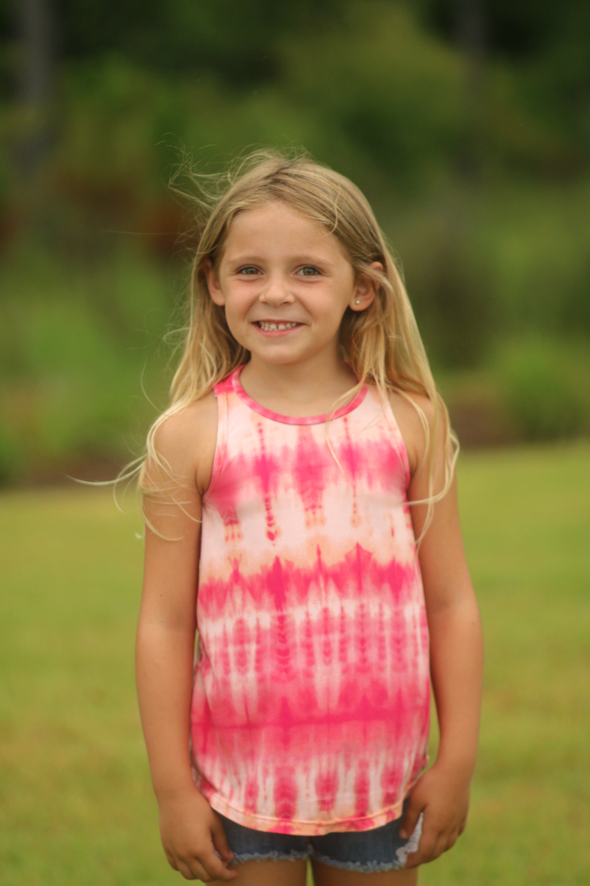 The Girls’ Sundown Tank features a beautiful open twist-back, along