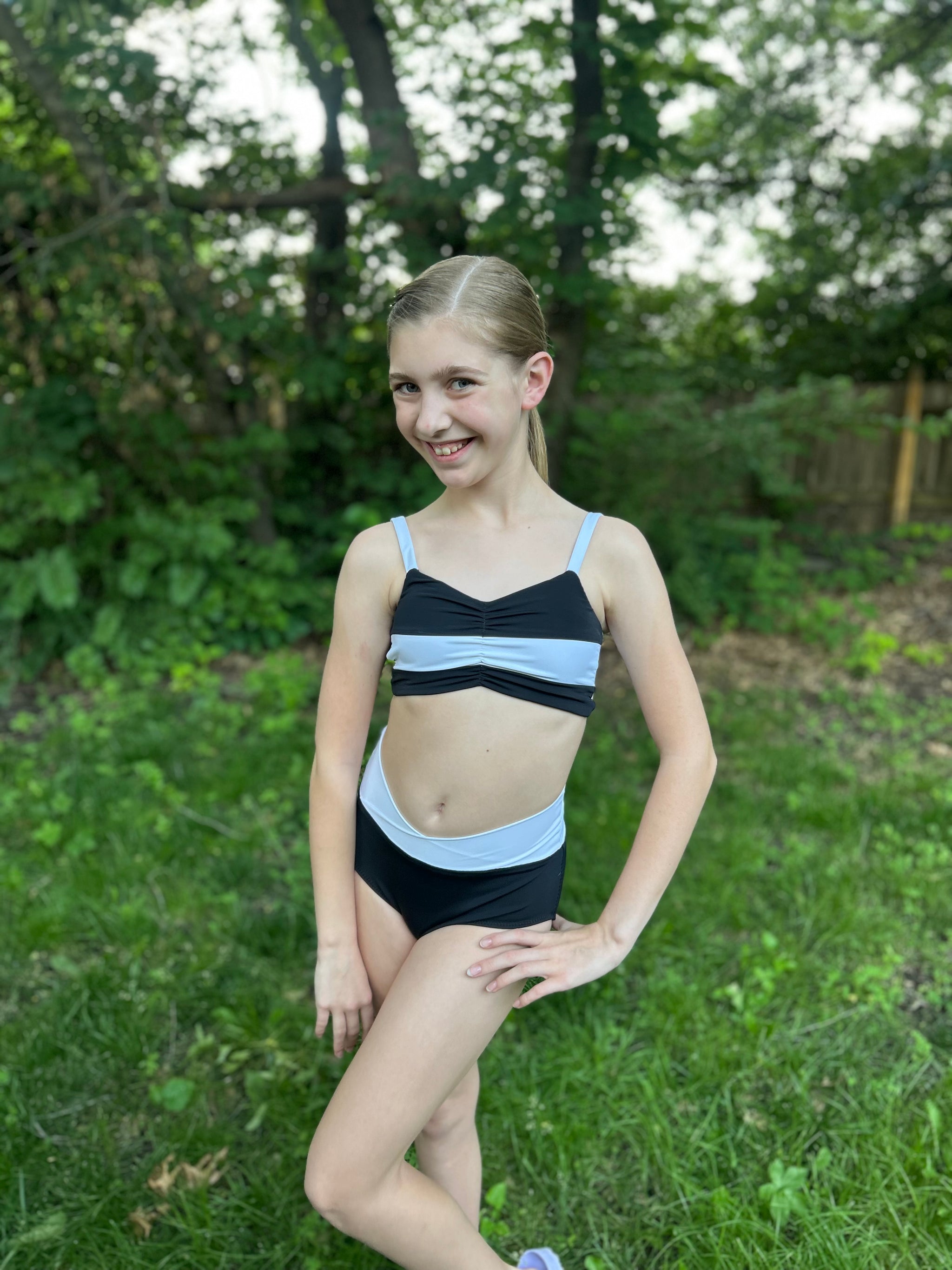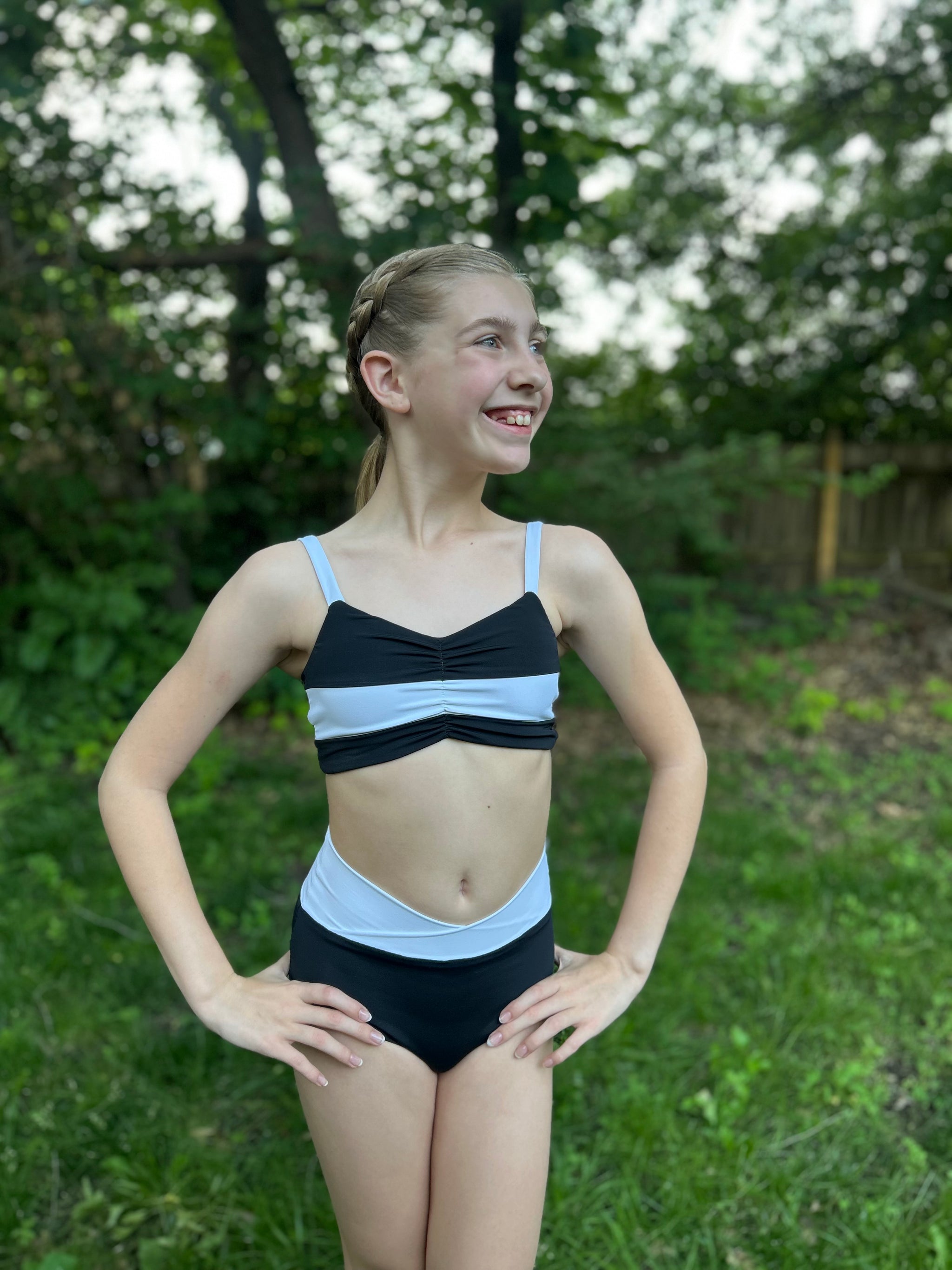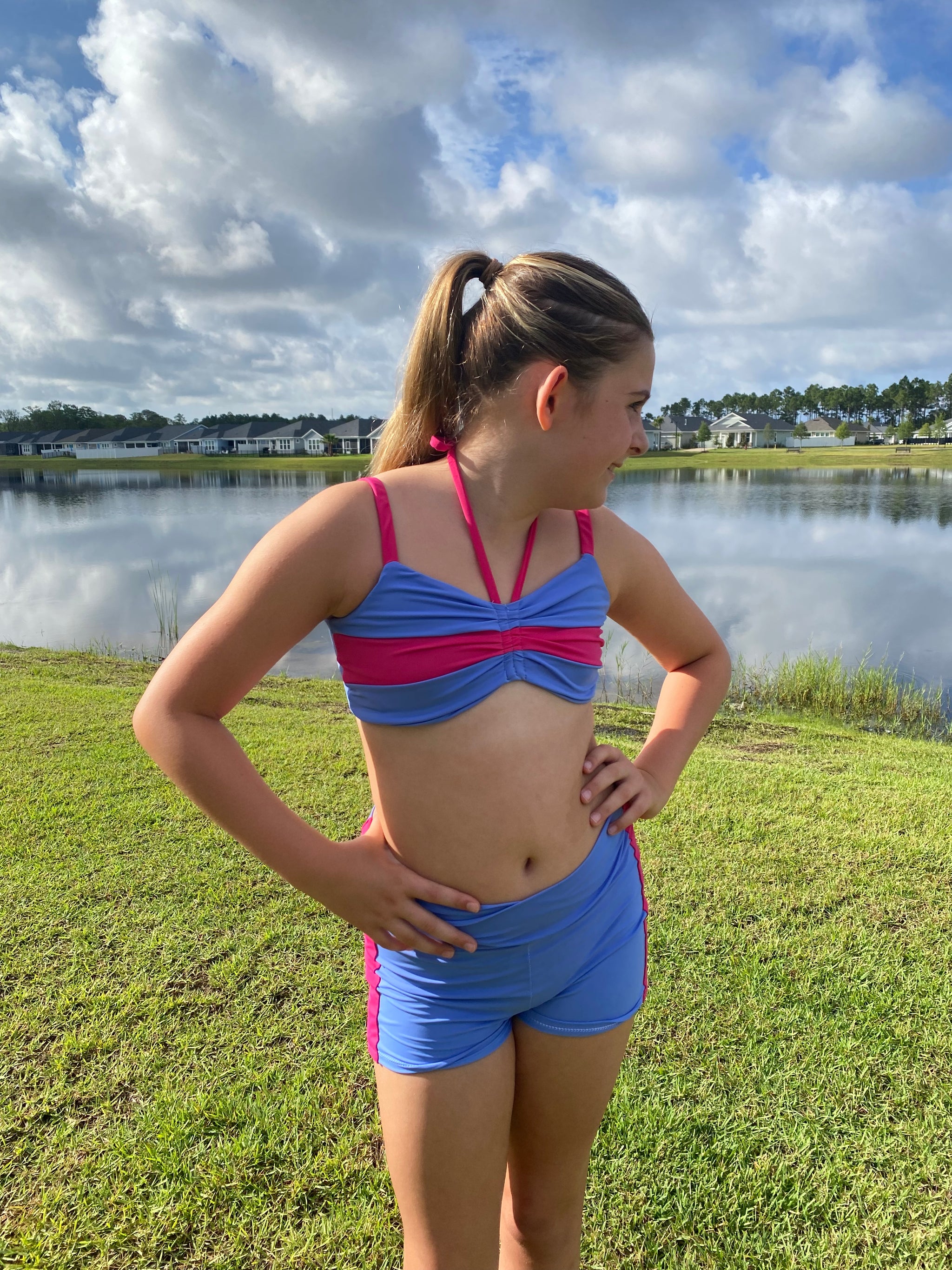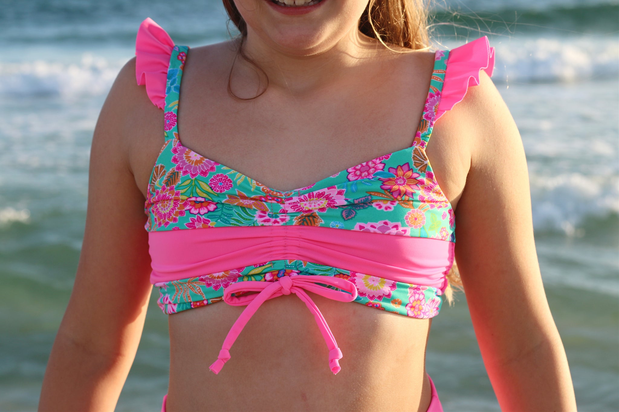 The Cali Top features a cinched bodice, either solid fabric or color blocked with optional ties. Add the sweet ruffle detail to the strap and/or a twist back with two different fabrics for added fun. With tons of options, this top offers the flexibility to take if from the dance class to all your water adventures. Pairs excellent with the Ciara Bottoms or Marlow Shorts shown paired in these photos.