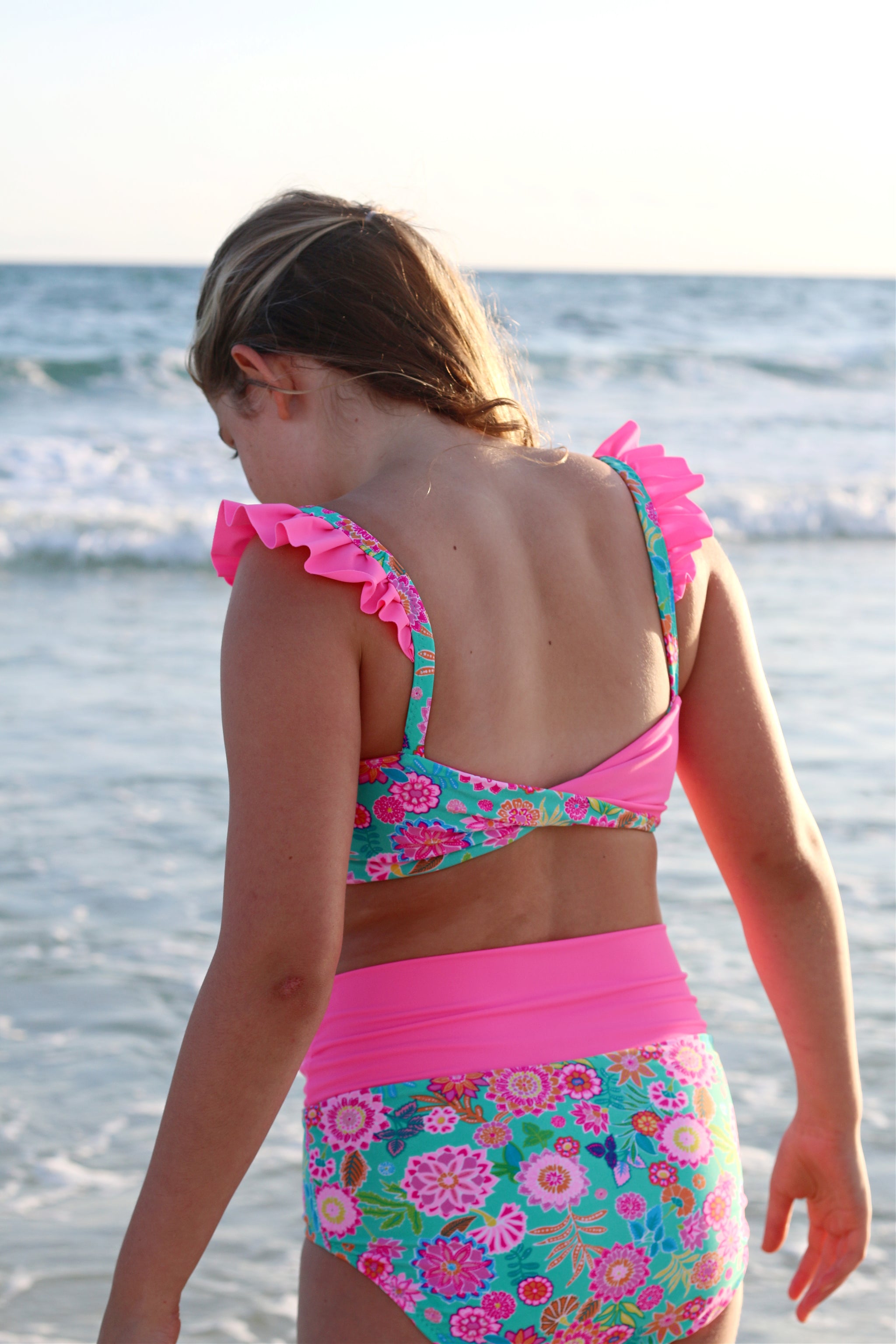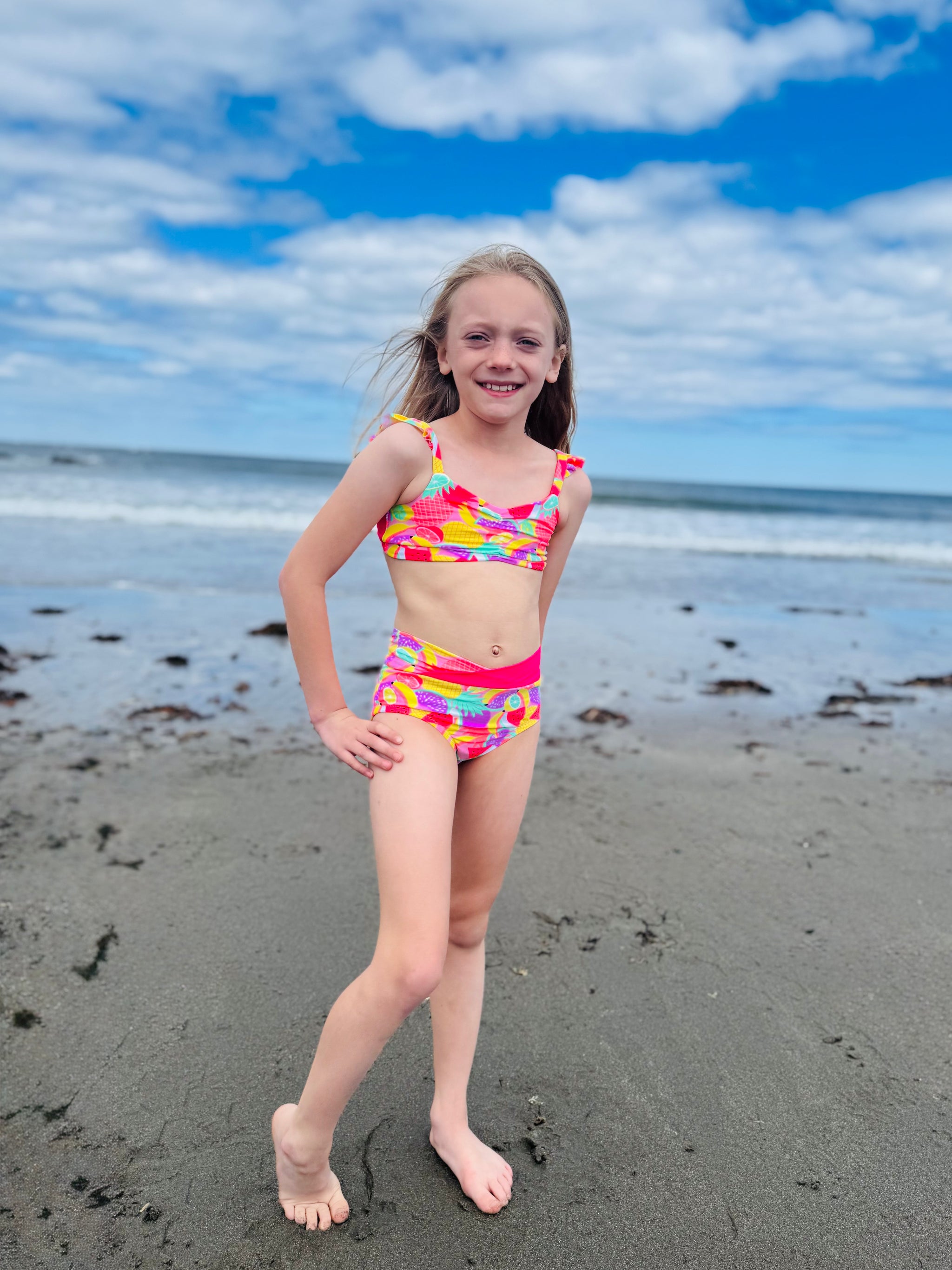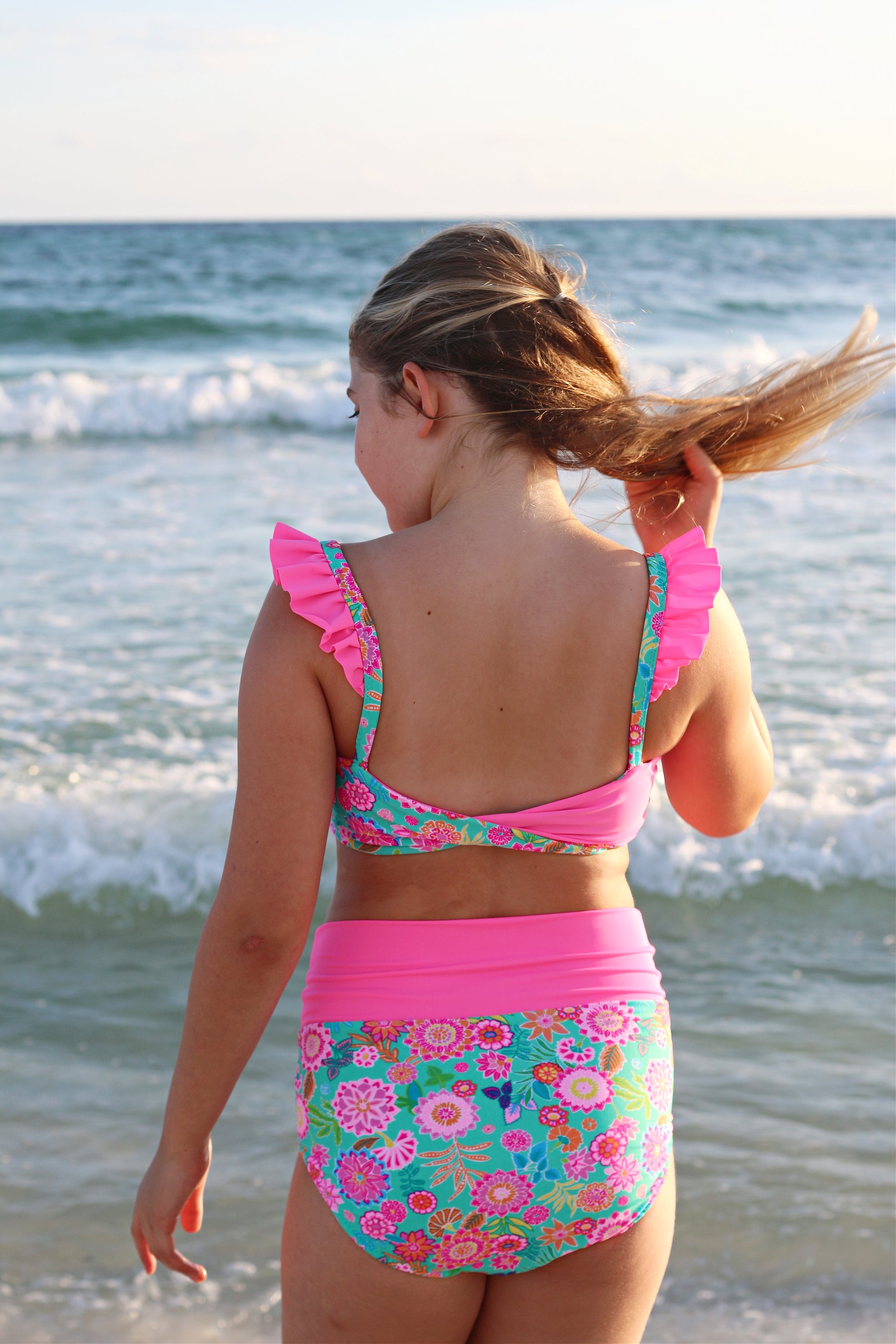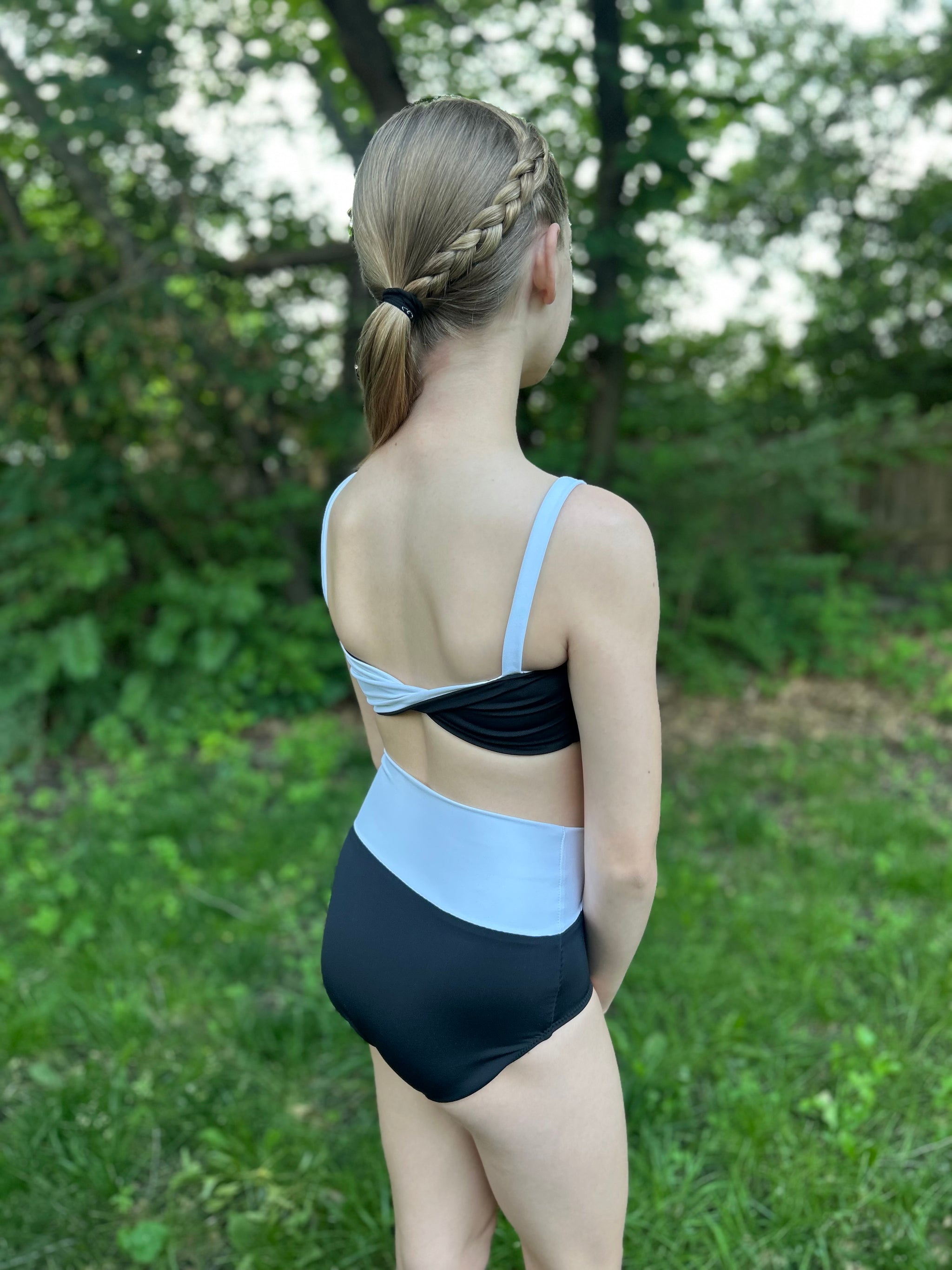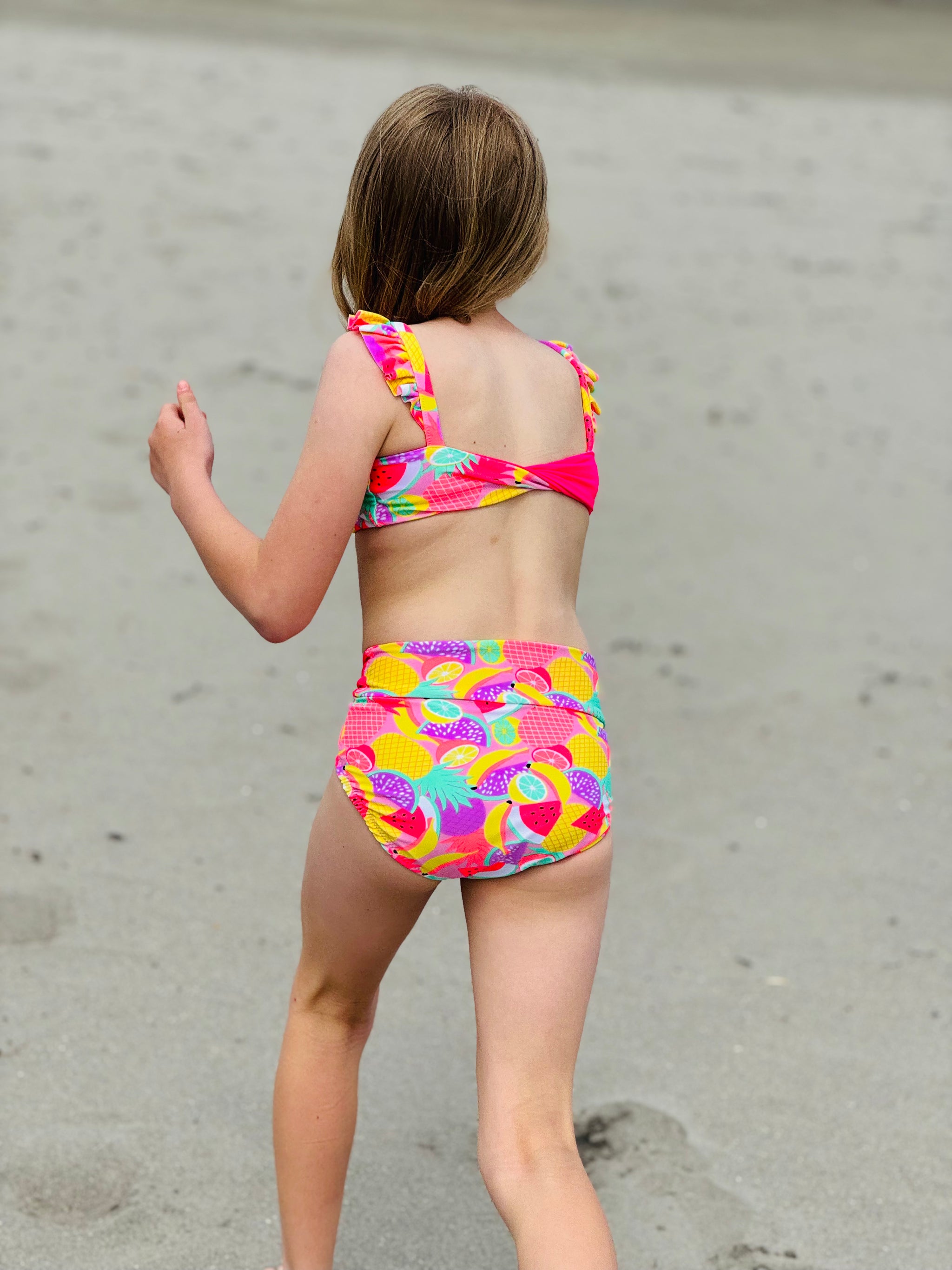 The Cali Top features a cinched bodice, either solid fabric or color blocked with optional ties. Add the sweet ruffle detail to the strap and/or a twist back with two different fabrics for added fun. With tons of options, this top offers the flexibility to take if from the dance class to all your water adventures. Pairs excellent with the Ciara Bottoms or Marlow Shorts shown paired in these photos.