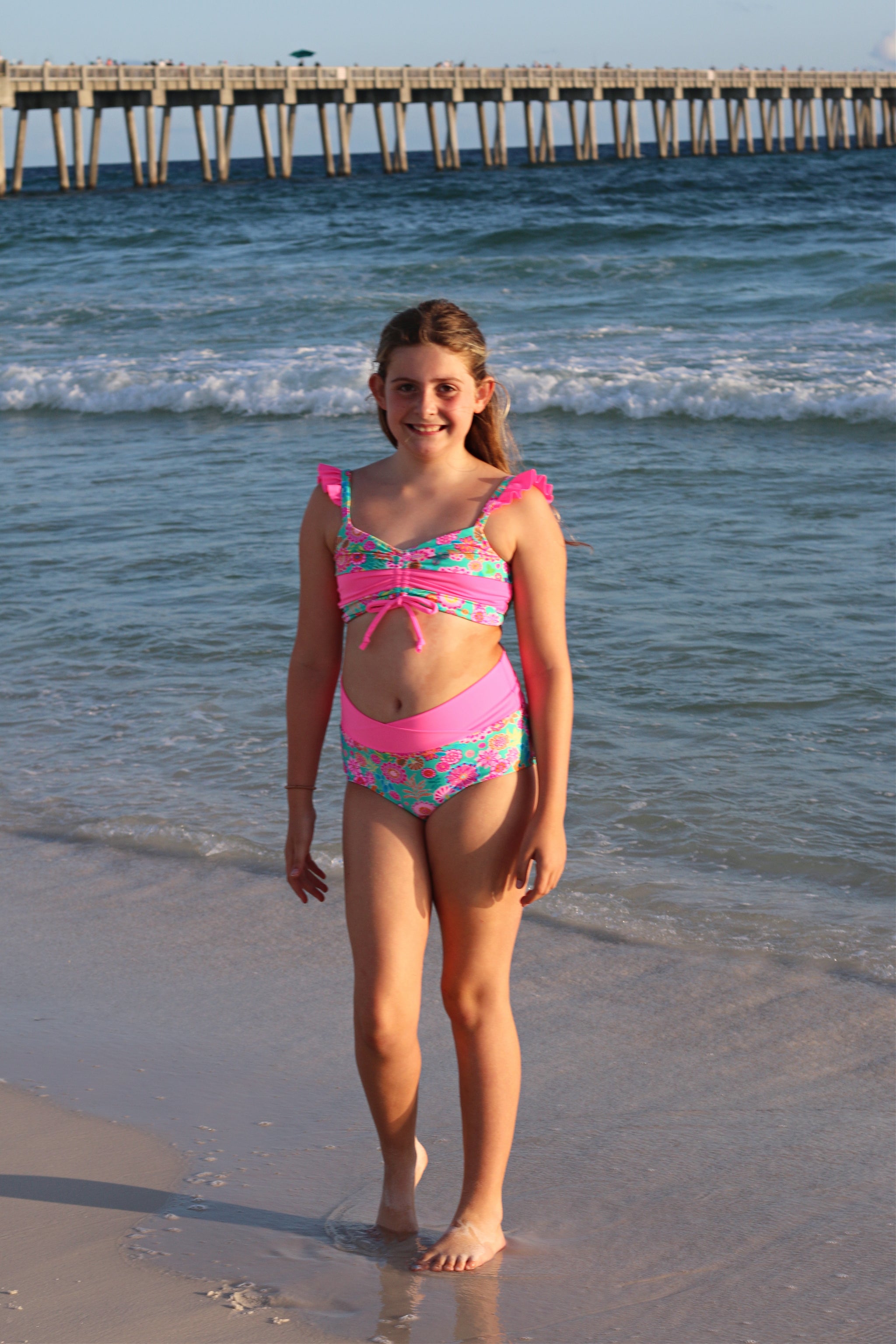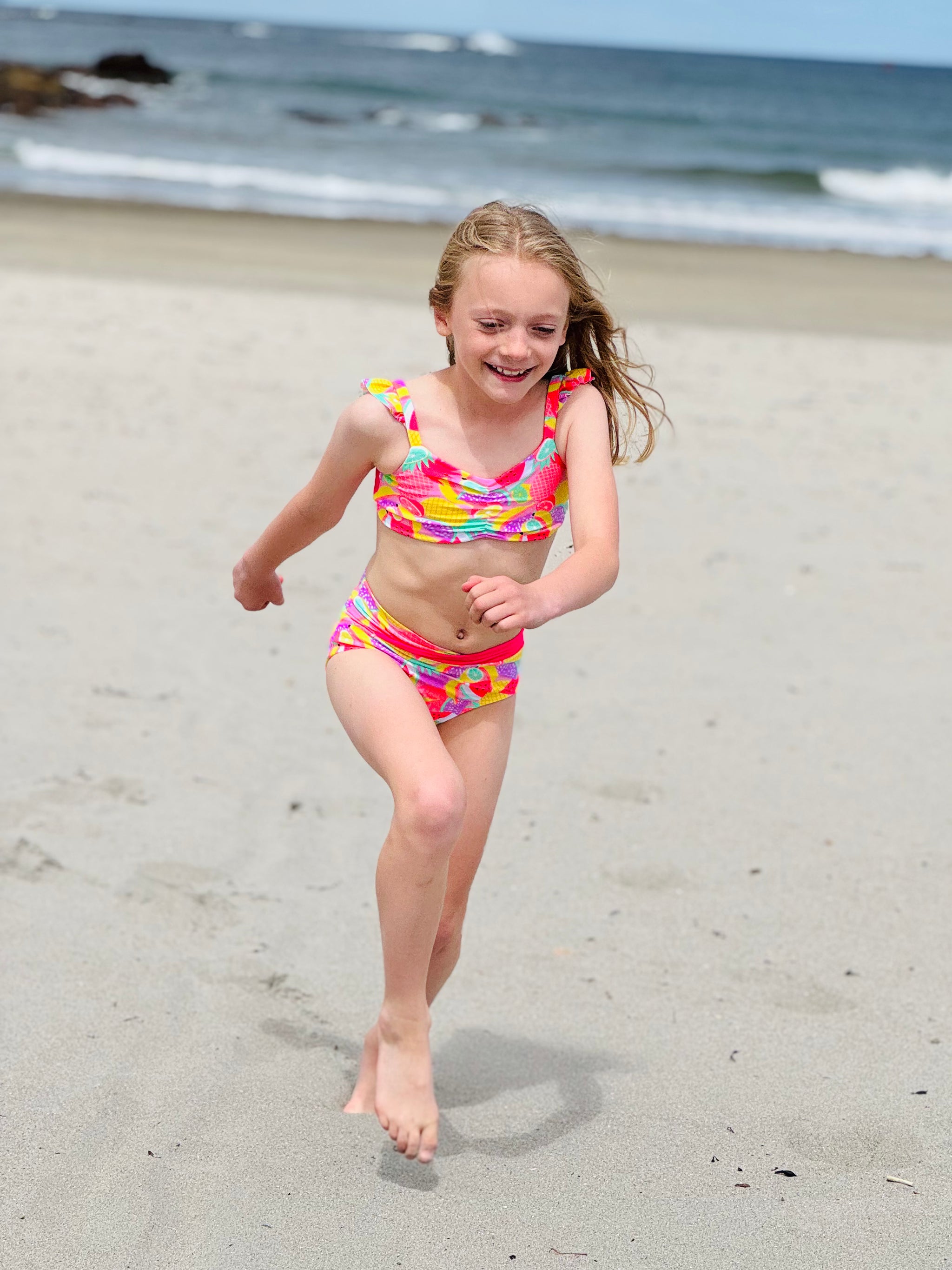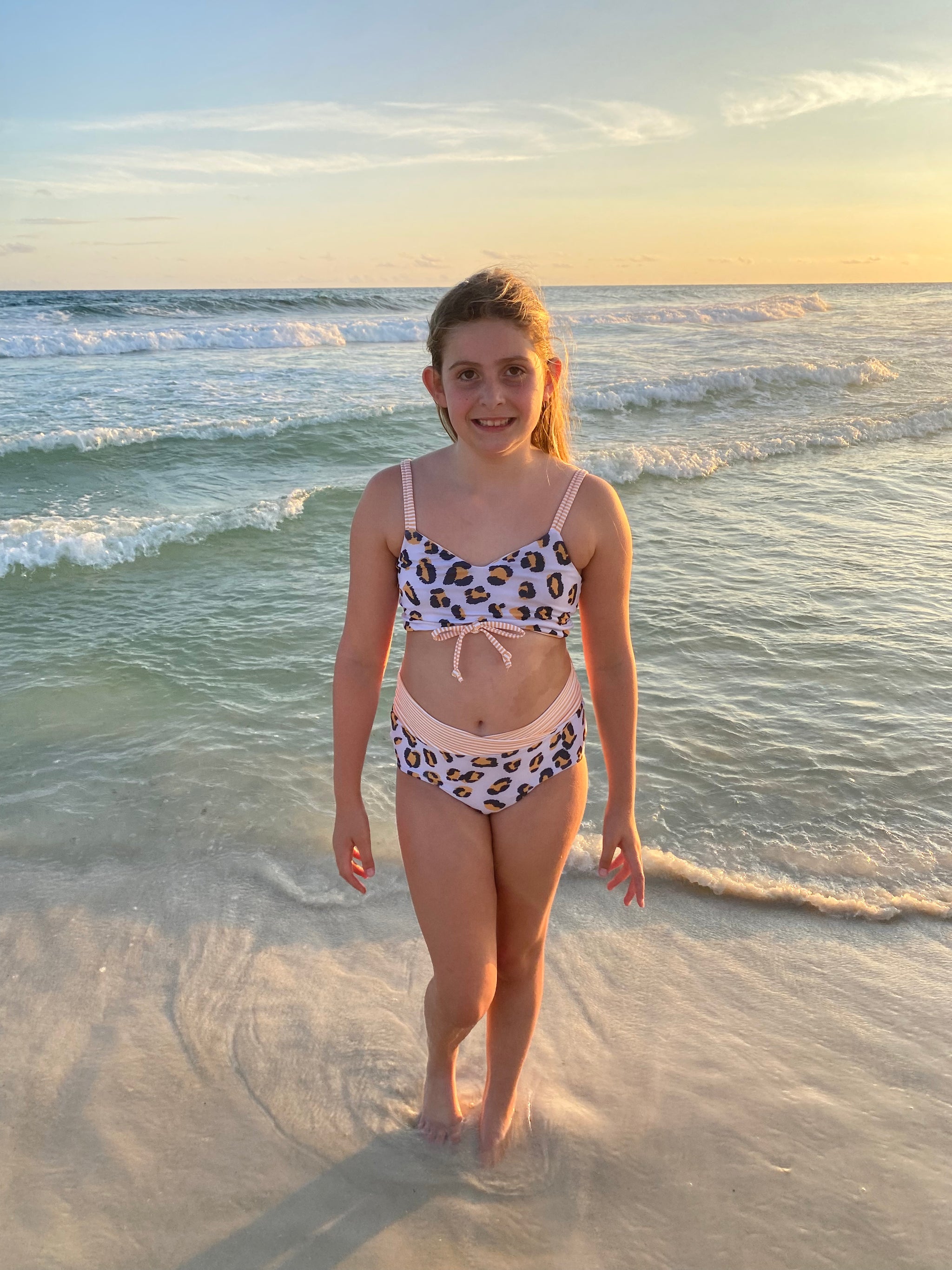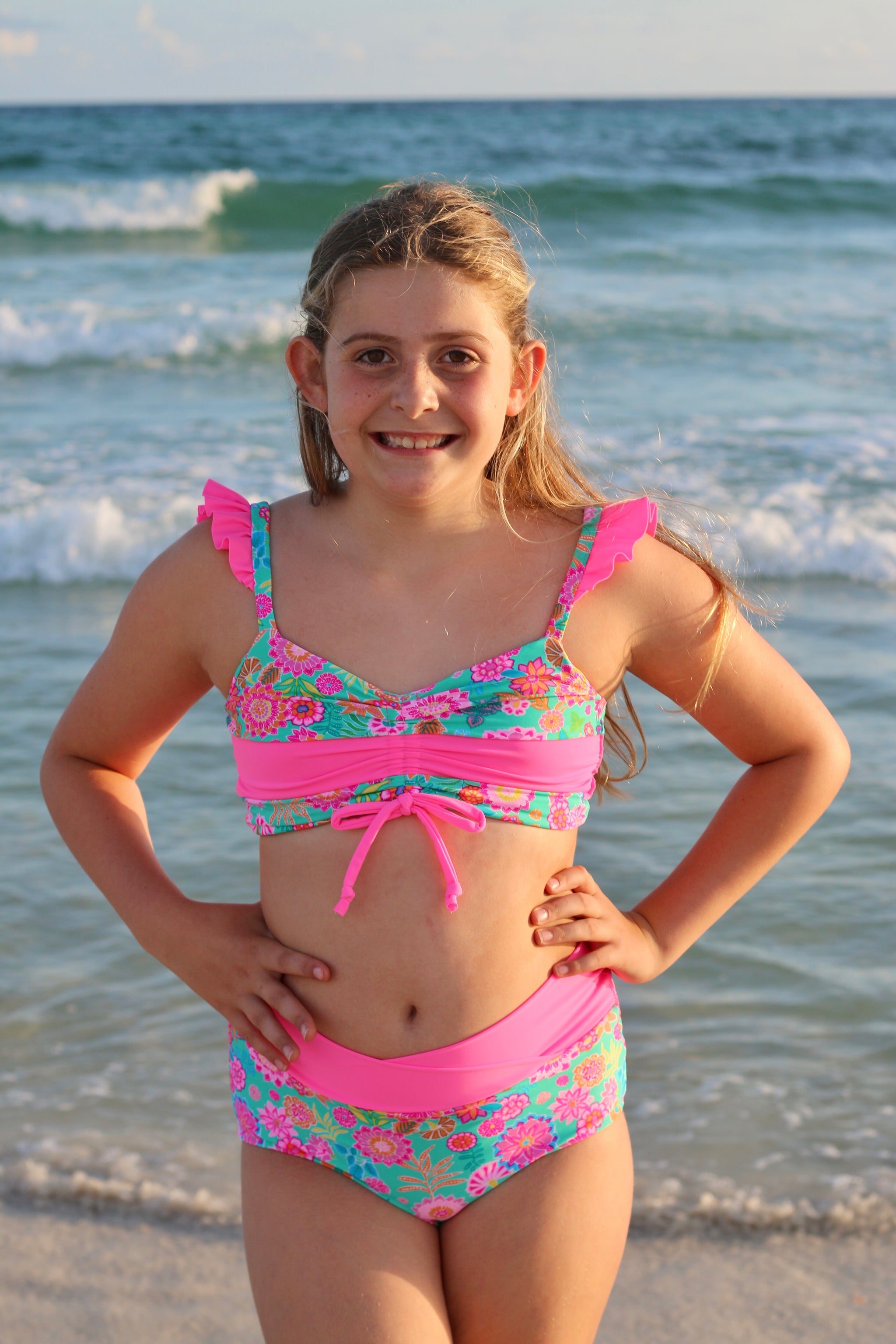 The Cali Top features a cinched bodice, either solid fabric or color blocked with optional ties. Add the sweet ruffle detail to the strap and/or a twist back with two different fabrics for added fun. With tons of options, this top offers the flexibility to take if from the dance class to all your water adventures. Pairs excellent with the Ciara Bottoms or Marlow Shorts shown paired in these photos.