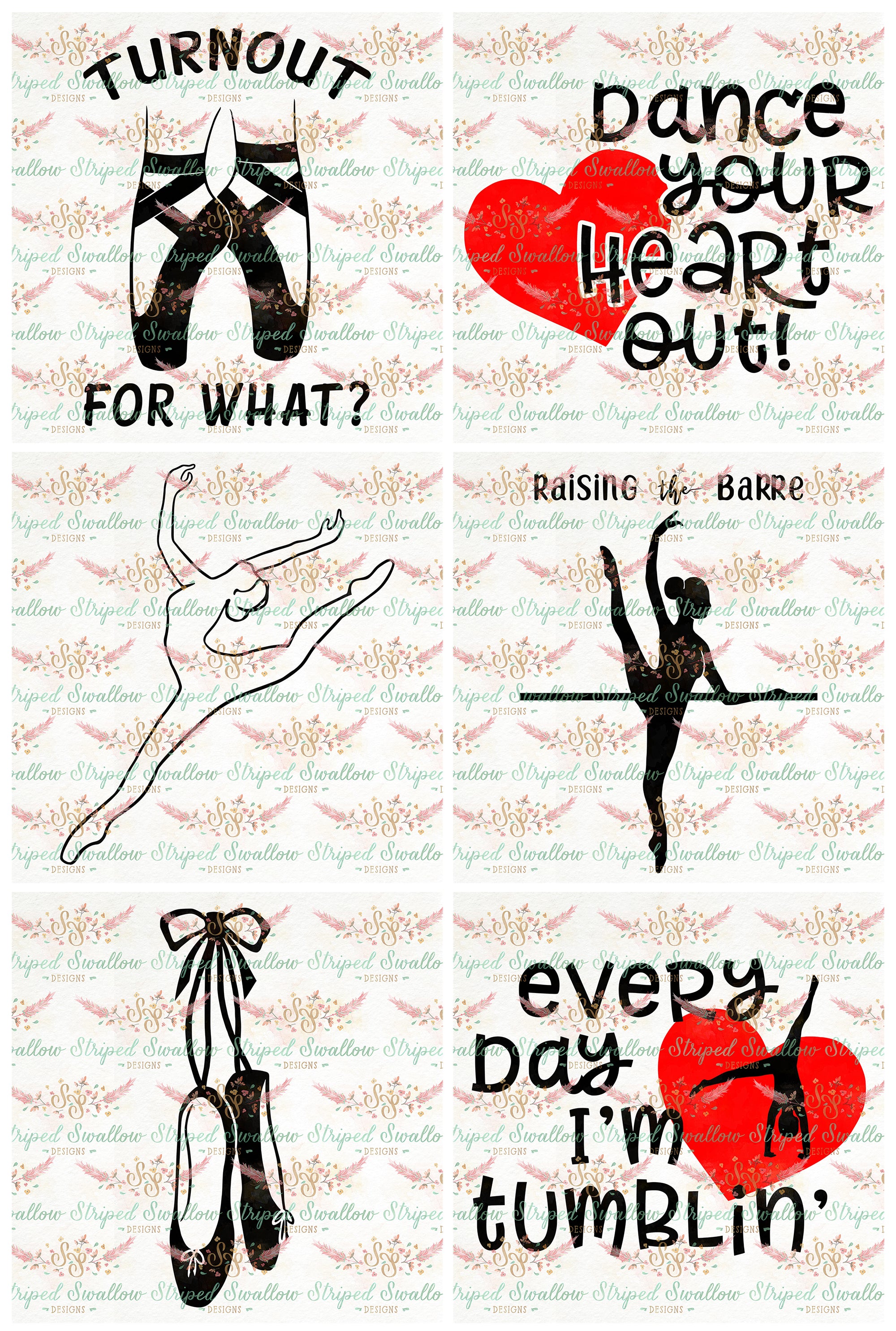 Digital Cut Files included in the bundle: Raising the Barre, Dance Your Heart Out, Every Day I'm Tumbling, Continuous Line Arabesque, Turnout for What, and Making a Pointe.