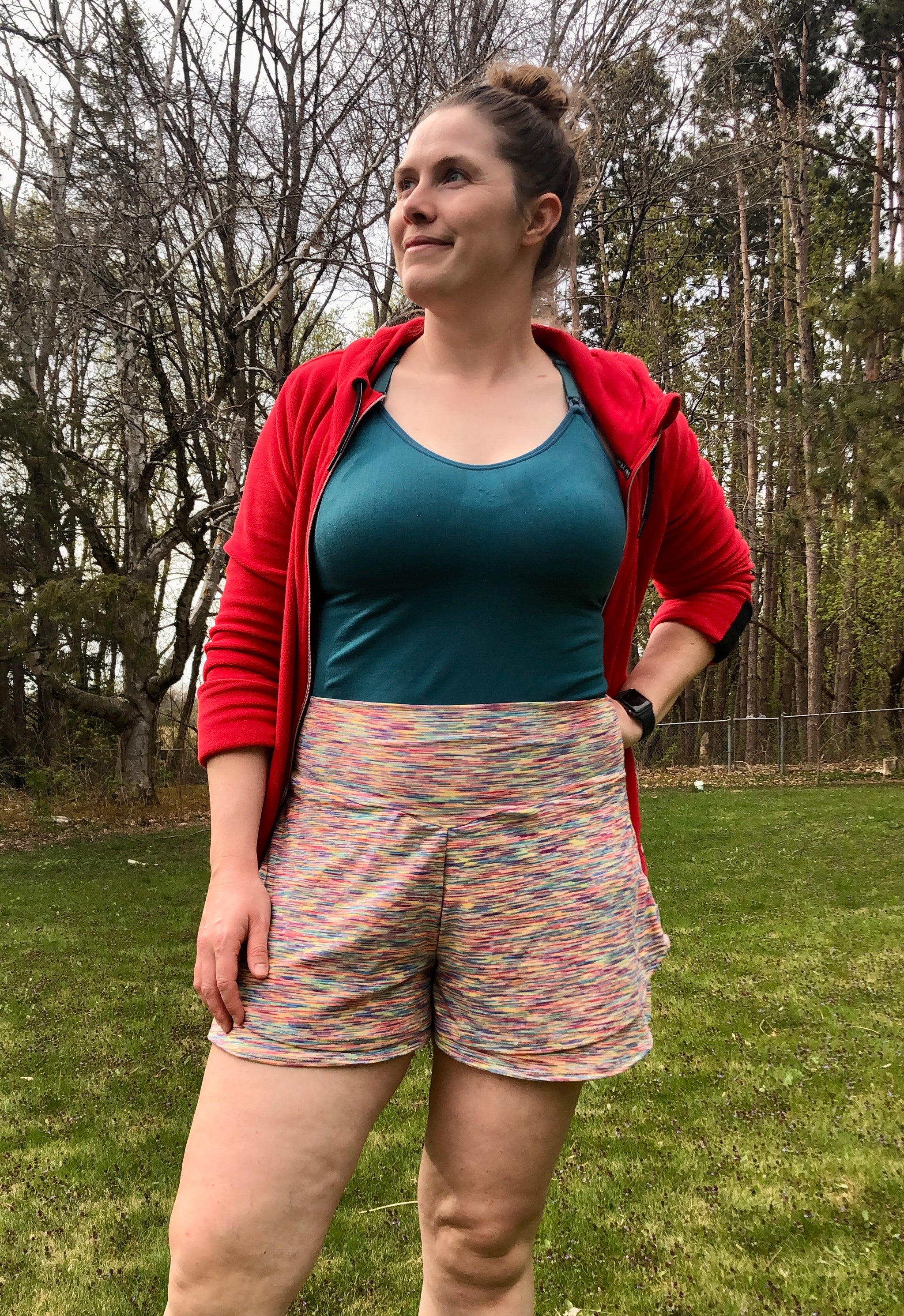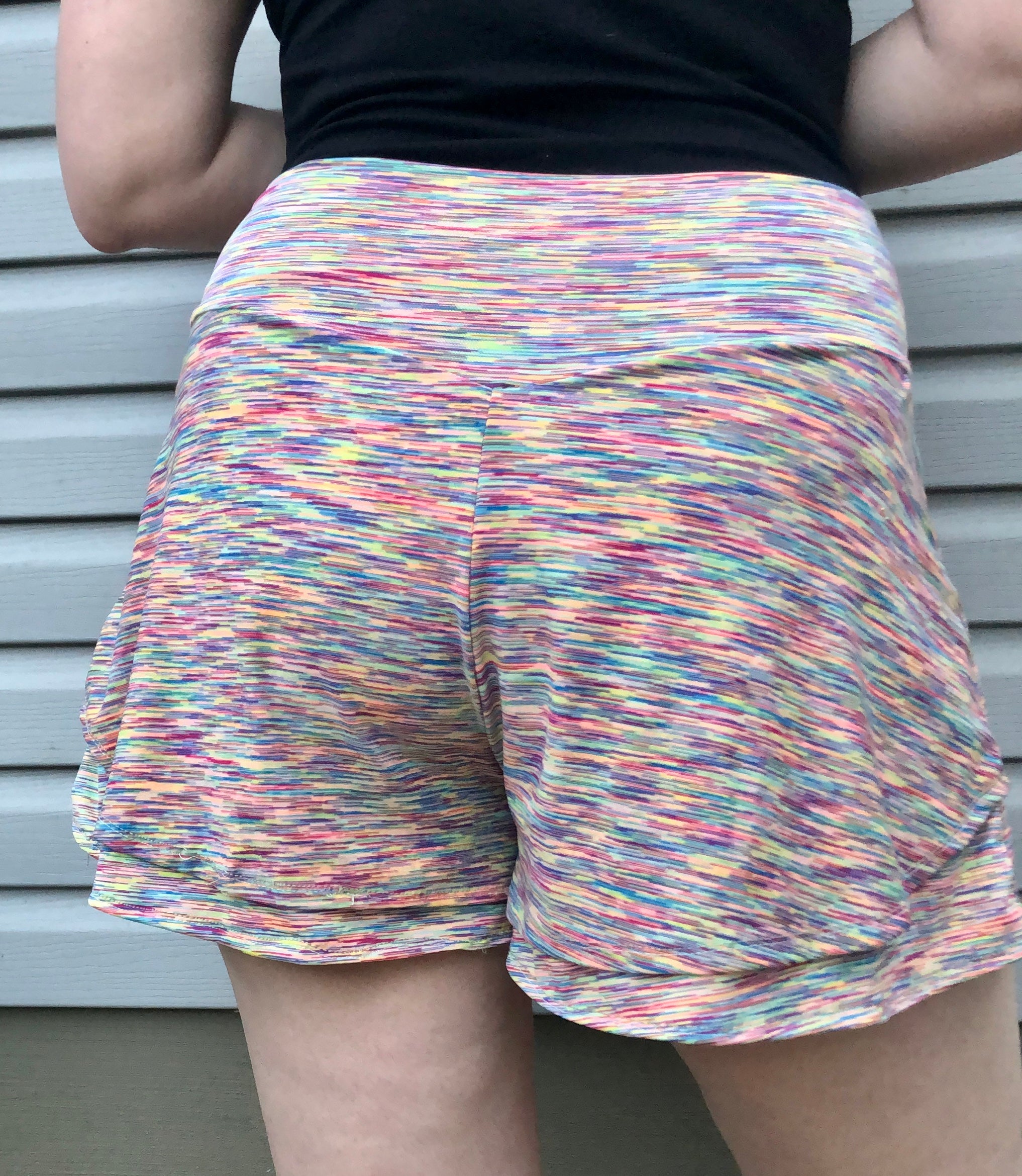 Elevate your everyday wardrobe with these beautiful double layer shorts, designed with a flowy silhouette and built in undershorts. Or they can also be made as a single layer, perfect for activewear. This pattern was designed with knits in mind.